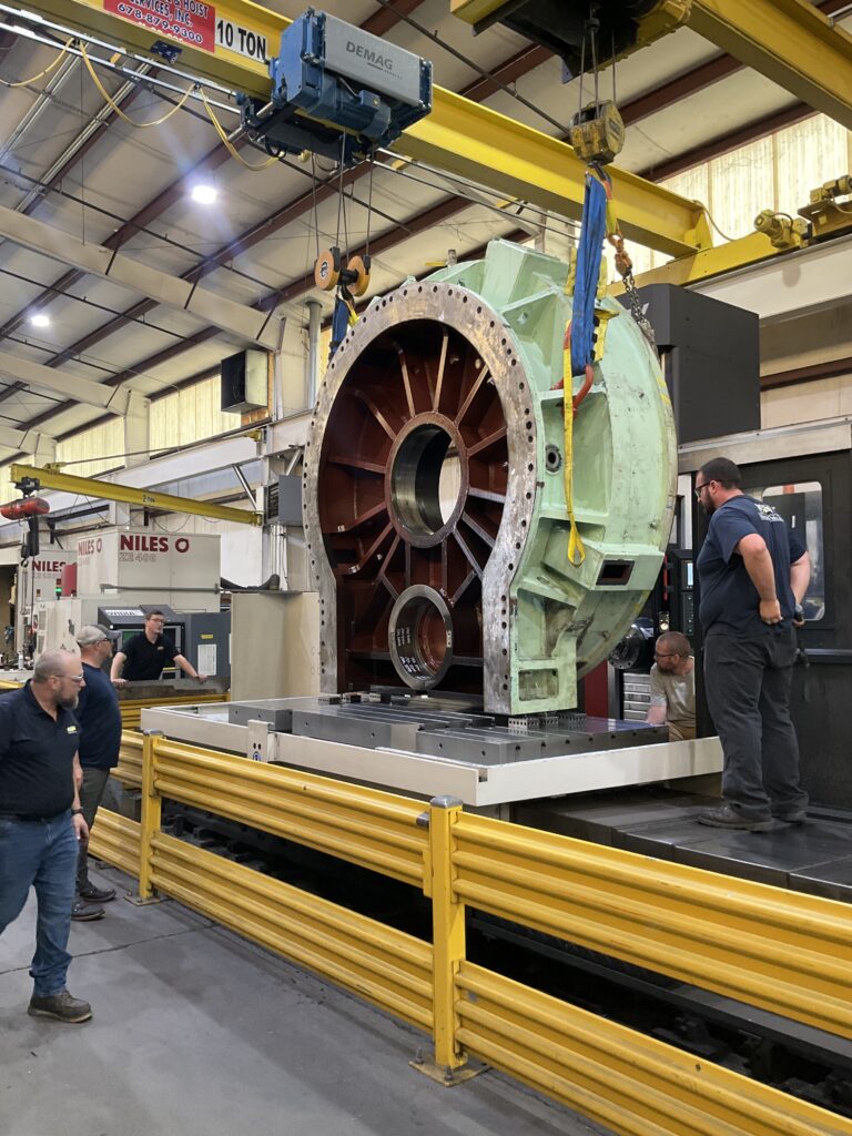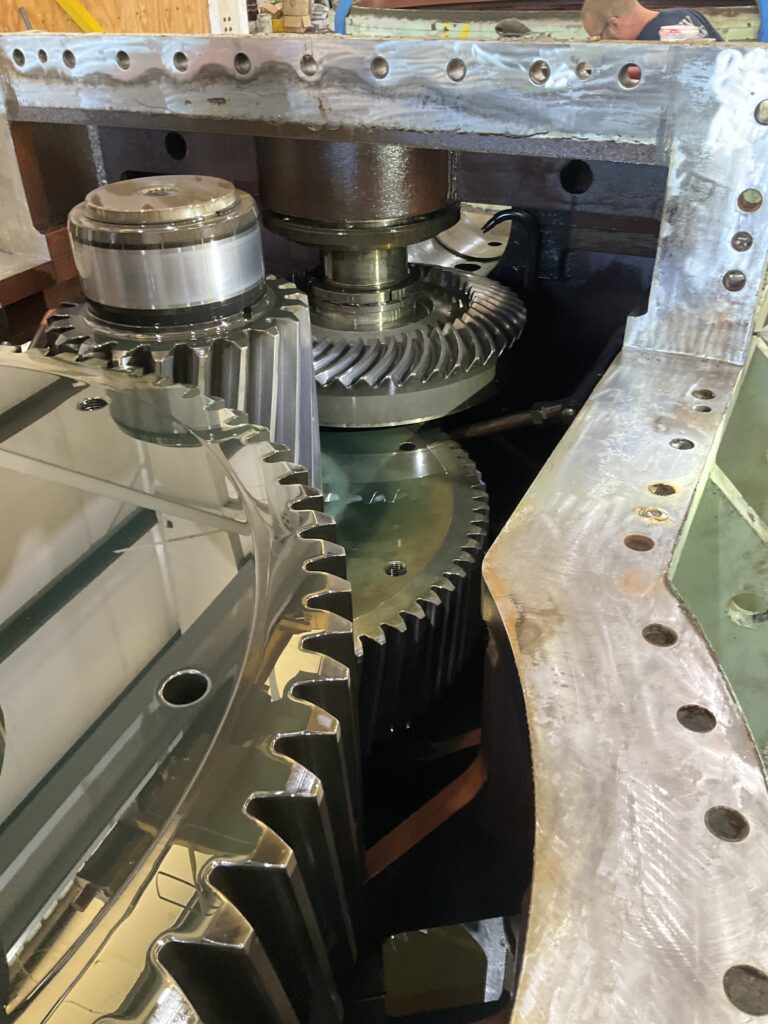 Even with our current high-capacity cranes and forklifts, we couldn’t lift the entire 145,000-pound gearbox off the trailer. So, we brought in a rigger with two 100,000-pound capacity forklifts to remove it from the trailer and move into the building. Once the gearbox was inside the building, our equipment was able to move it piece by piece. But this was just the beginning of the challenges we had to solve.